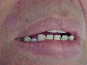 Reabilitação estética com com prótese removível superior e dentadura inferior com gengiva artificial caracterizada.